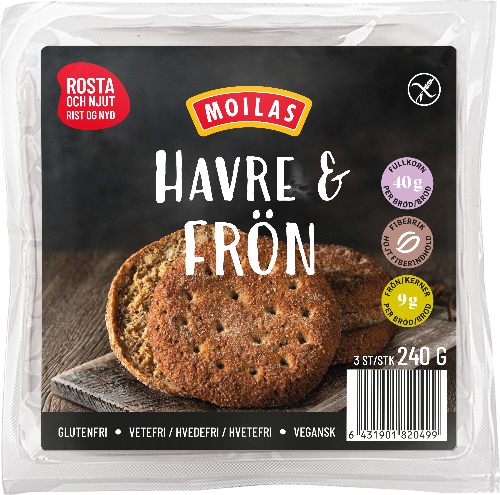 Glutenfri fullkornsHAVRE 50 % (mjöl, flingor, gryn), vatten, frön 11 % (hampa, pumpa, chia), sirap, rismjöl, salt, psyllium, jäst.