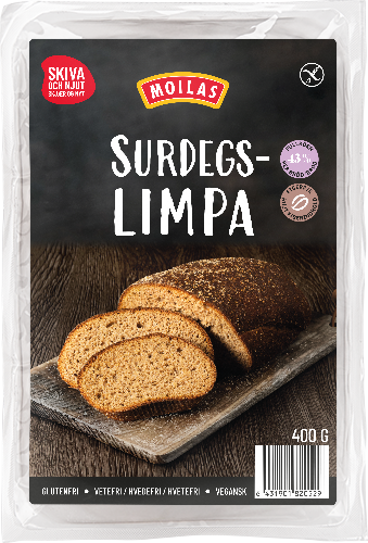 Moilas Surdegslimpa är ett varsamt bakat, glutenfritt surdegsbröd med en mild, lätt söt och balanserad smakprofil. Brödet bakas direkt på ugnsdäcket utan form, vilket ger en fyllig, rustik skorpa och en mjuk, saftig inkråm.