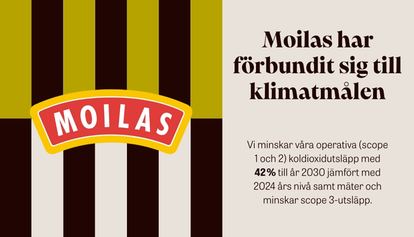 Moilas Oy har åtagit sig att minska sina absoluta växthusgasutsläpp inom scope 1 och scope 2 med 42 % till år 2030 jämfört med 2024 års nivå, samt att mäta och minska sina scope 3-utsläpp.